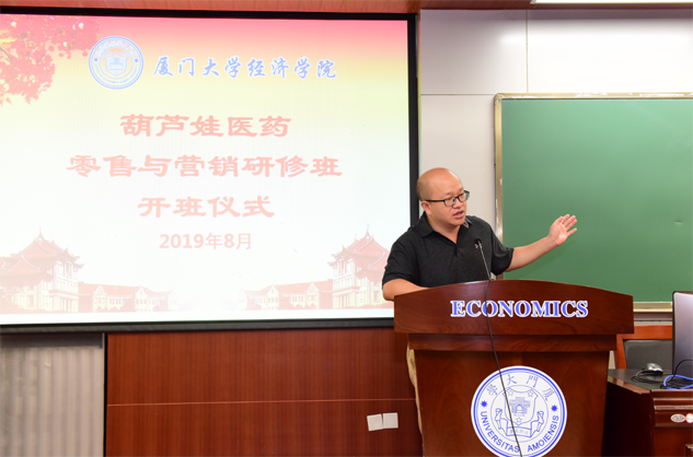 在开班仪式上,廖景峰主任首先代表厦门大学经济学院热烈欢迎28圈医药零售与营销研修班的学员到厦大学习,并就厦门大学及经济学院的相关情况进行了介绍。他说,28圈学员走进厦大就是厦大的校友,希望未来的日子能够关心、支持母校的发展,多提宝贵意见,同时他也祝大家在厦大学习期间学有所成、学有所获。